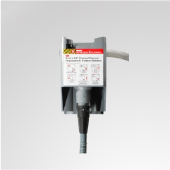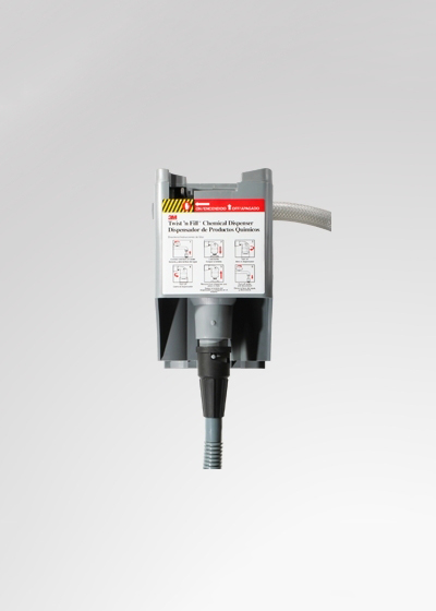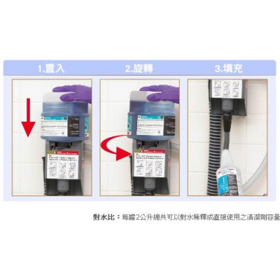 在接有水管的調節器上(如圖所示)將濃縮清潔劑以"套上再扭轉"的簡單步驟,即可以輕鬆的稀釋清潔劑。可大幅度節省公司的清潔劑成本,管理用量容易,節省空間,不占儲存空間。